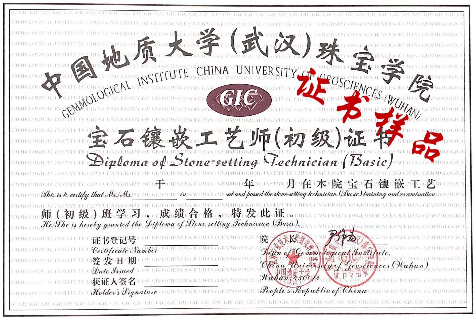 课程结束经考试合格者,能获得由中国地质大学(武汉)珠宝学院统一颁发的“GIC宝石镶嵌工艺师(初级)证书”。