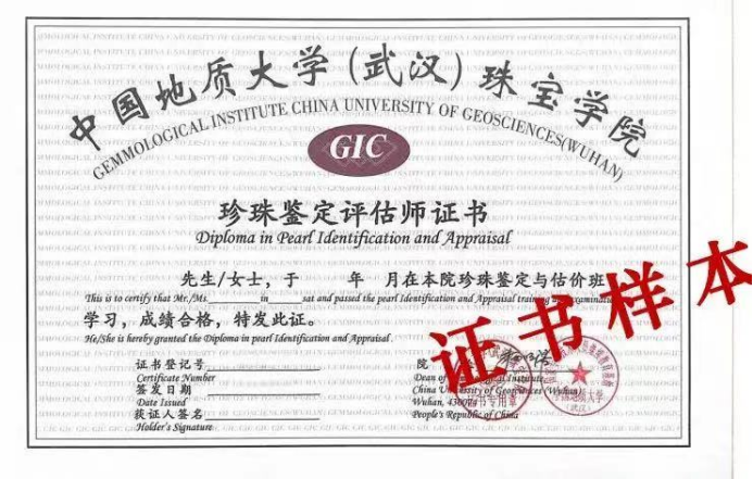 学习期满经考试合格者可获得由中国地质大学(武汉)珠宝学院统一颁发的“GIC珍珠鉴定评估师证书”。