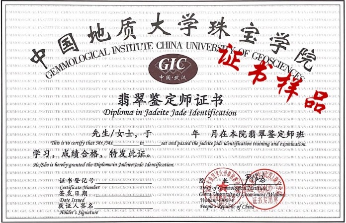 学习期满经考试合格者可获得由中国地质大学(武汉)珠宝学院统一颁发的“GIC和田玉鉴定师证书”。