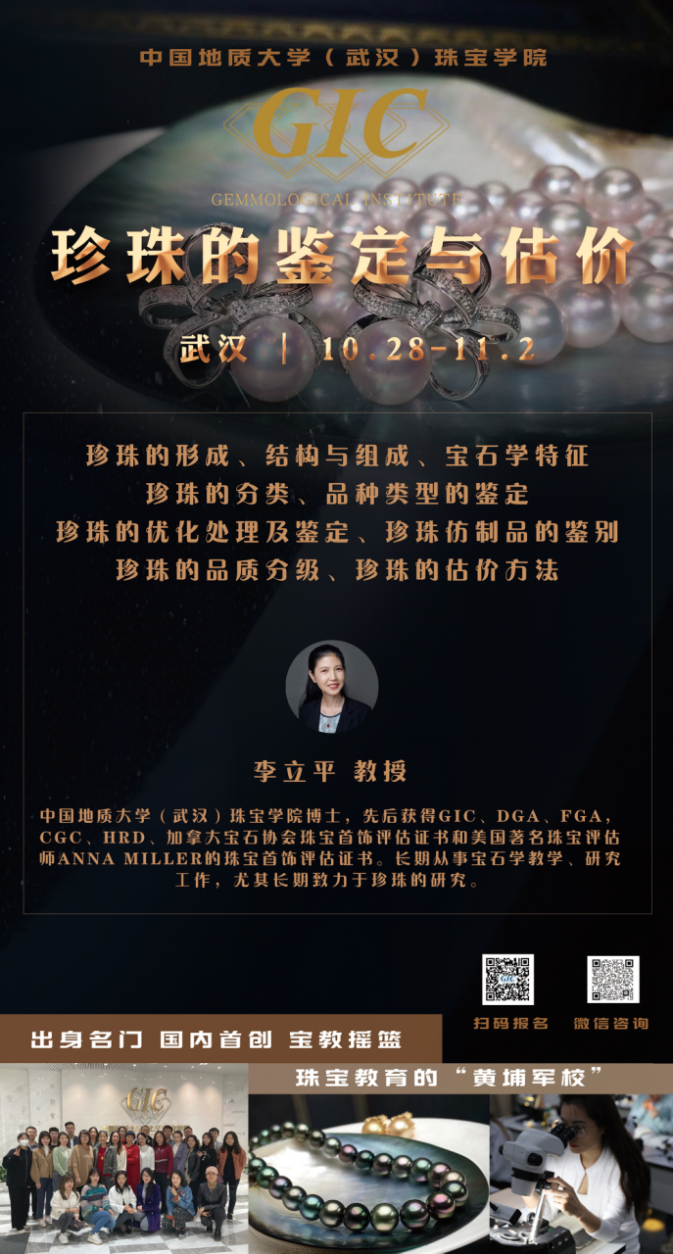 108#GIC珍珠的鉴定与估价课程系统介绍了珍珠的形成、结构与组成、宝石学特征,珍珠的分类、 品种类型的鉴定、珍珠的优化处理及鉴定、珍珠仿制品的鉴别、珍珠的估价方法。