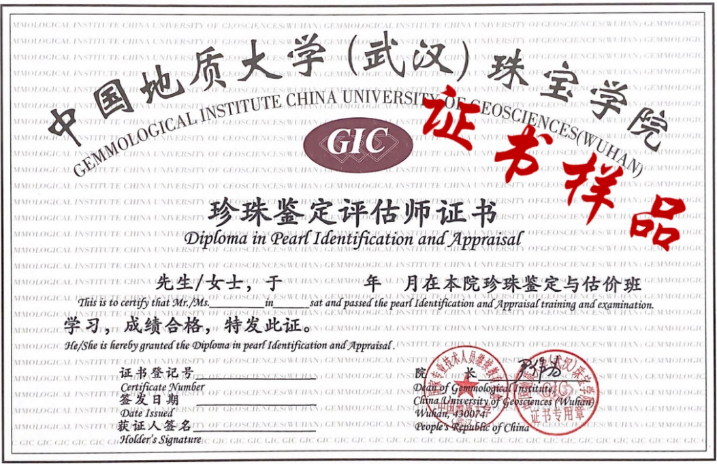 学习期满经考试合格者,可获得由中国地质大学(武汉)珠宝学院统一颁发的“GIC珍珠鉴定评估师证书”。