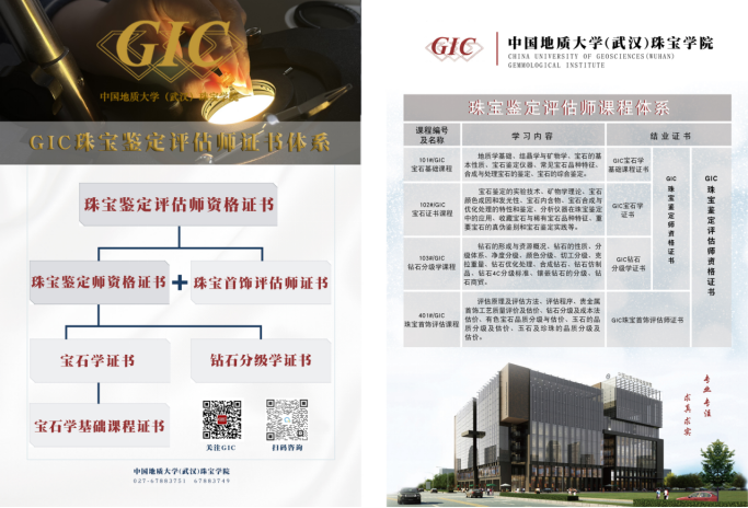 中国地质大学是教育部直属全国重点大学, 是国家批准设立研究生院的大学,是国家“211工程”、国家“双一流”建设高校。学校于2012年8月获批准建设“国家专业技术人员继续教育基地”。珠宝学院(简称GIC)是我国最早的珠宝教育机构,是中国珠宝人才培养的最高学府,被誉为“宝教摇篮”。