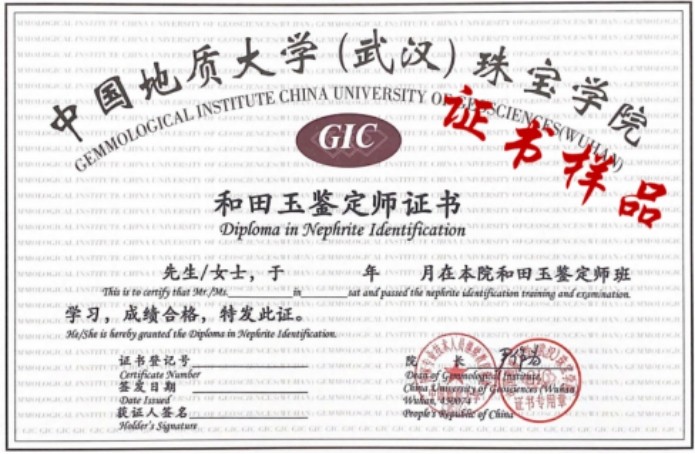学习期满经考试合格者可获得由中国地质大学(武汉)珠宝学院统一颁发的“GIC和田玉鉴定师证书”。