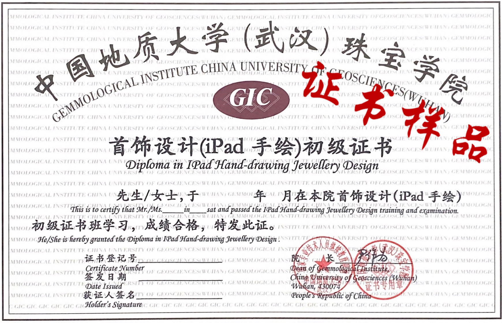课程期满并考试合格者,可获得中国地质大学(武汉)珠宝学院统一颁发的“GIC首饰设计(ipad手绘)初级证书”。